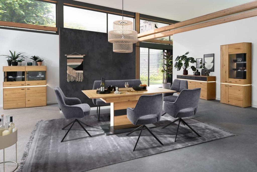 100% Polyester, Farbe anthrazit, Chenille Optik mit Keder, Gestell Ovalrohr schwarz matt lackiert, Taschenfederkern-Luxuskomfortsitz, 180° drehbar mit Nivellierung, Belastbarkeit bis maximal 120 kg, Sitz BHT ca. 48/49/46 cm, BHT ca. 57/89/66 cm