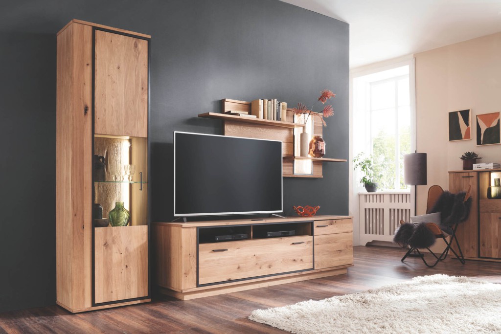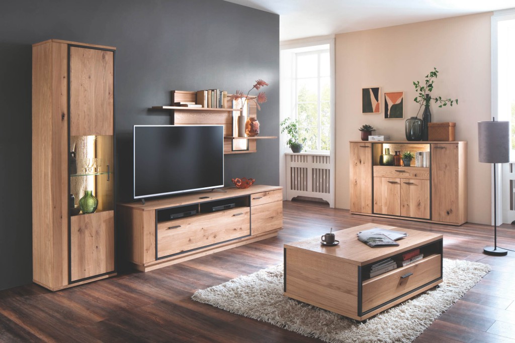 Front Asteiche Bianco massiv durchgehende Lamelle geölt, Frontabsetzung Metall anthrazit, Korpus außen Eiche Bianco furniert geölt, innen Eiche Bianco Nachbildung, Rückwand sichtbar massiv strukturiert geölt, Glas Parsol grau, Griff Metall anthrazit eingefräst, Türen & Schubkasten gedämpft, bestehend aus: