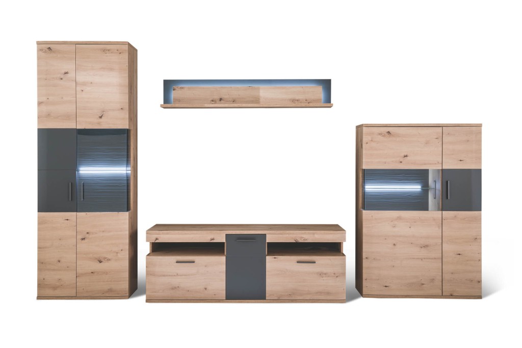 Front Balkeneiche tiefzieh Nachbildung, Absetzung anthrazit tiefzieh Nachbildung, Front- & Seitenglas Parsol grau, Korpus Balkeneiche Melamin Nachbildung, sichtbare Rückwande 3D anthrazit geschroppt, Griffe Metall iron black, Schubkästen Unterflurführung gedämpft, bestehend aus: