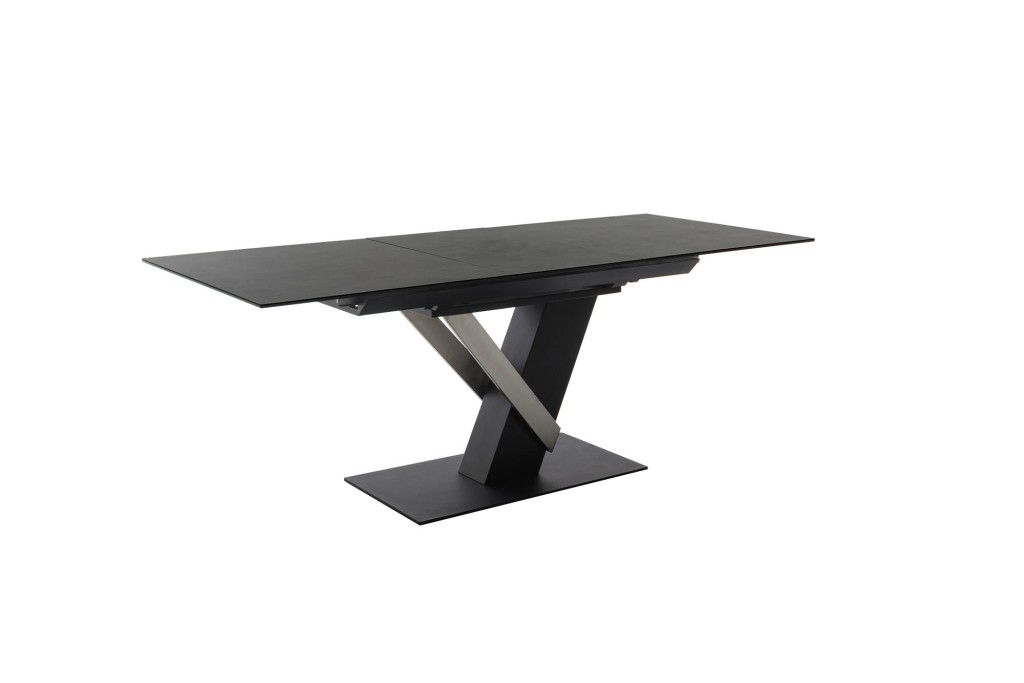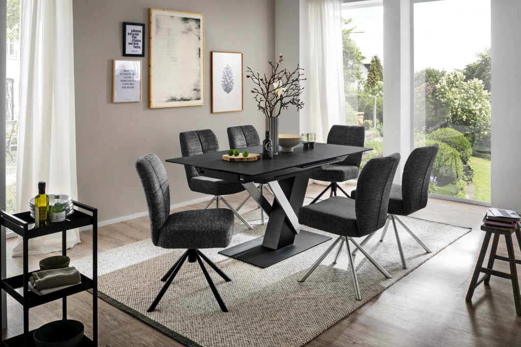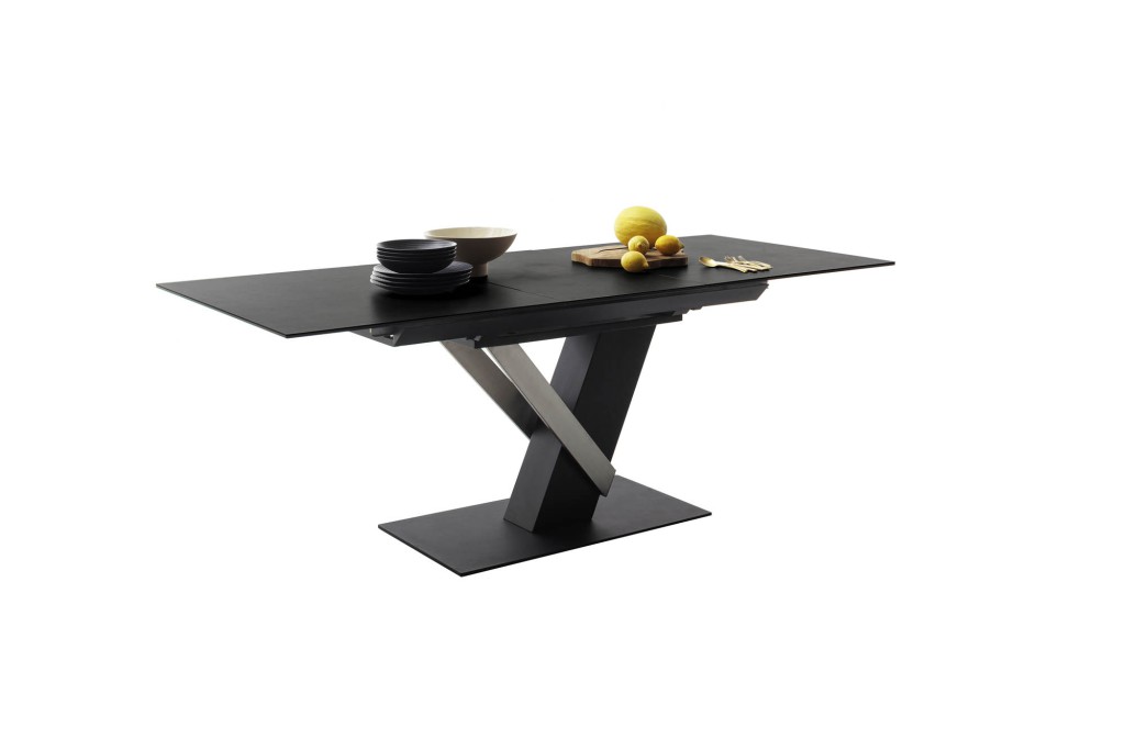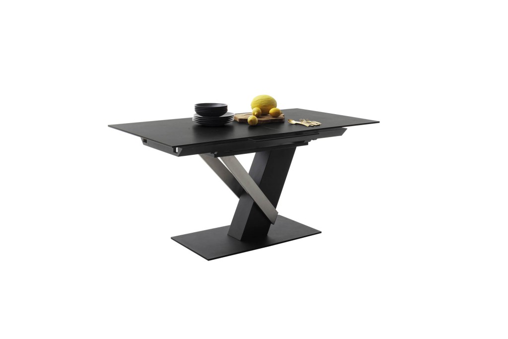 anthrazit, Synchronauszug, Einlegeplatte mit Liftfunktion, Keramik, Sicherheitsglas schwarz lackiert, 11 mm, Säule MDF, schwarz matt lackiert und Edelstahl gebürstet, Bodenplatte Metall, schwarz matt lackiert, LBH ca. 160(210)/90/76 cm