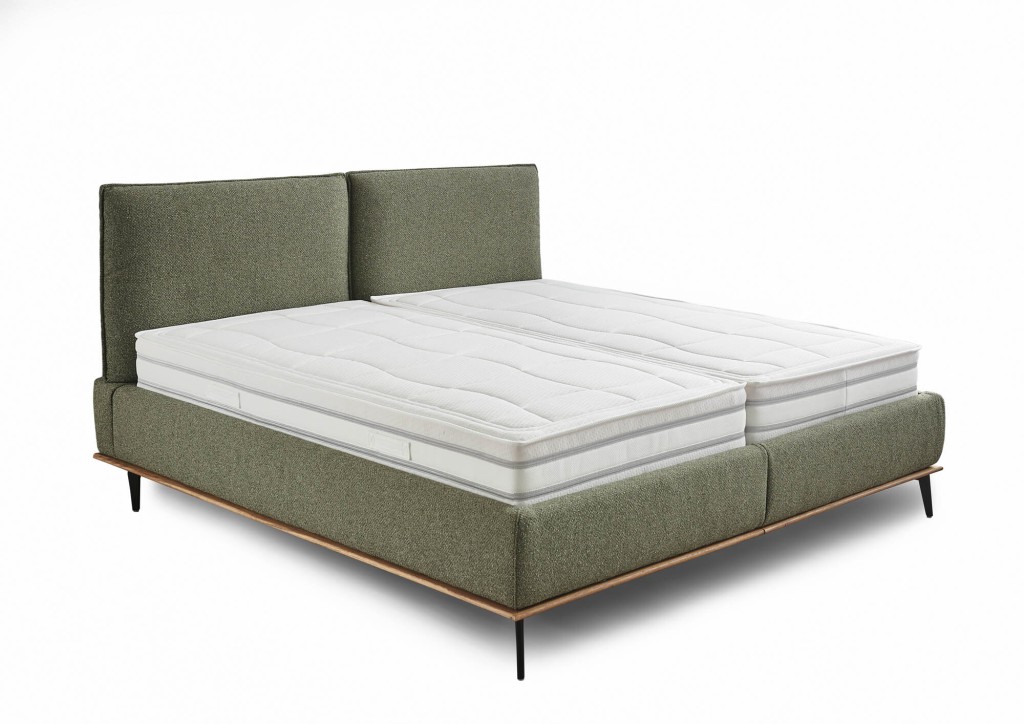 Flachgewebe, Nutzschicht 100 % recyceltes Polypropylen, Farbe lind, Kopfteil Rücken unecht, Metallfüße schwarz, Buchenschichtholz Lattenrahmen, Kopfteil 4-fach manuell verstellbar, Fußteil aufklappbar, Bettkasten leicht konisch mit Sichtholzrahmen in Wildeiche, Gasdruckfeder zum Öffnen, Matratzen Taschenfederkern H2/H3, Drellbezug geteilt, Liegefläche ca. 180x200 cm, BHT ca. 193/106/232 cm