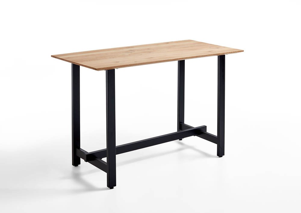 Tresentischgruppe bestehend aus: Tresentisch, Platte Charakter-Eiche massiv geölt, Facette 30mm, Gestell Eisen schwarz, LBH ca. 140/70/ 92 cm 2 x Tresenstuhl, Microfaser Aberdeen, Farbe anthrazit 2 x Tresenstuhl, Microfaser Aberdeen, Farbe stone